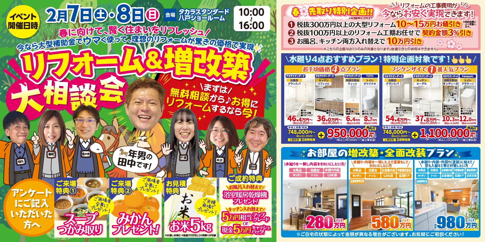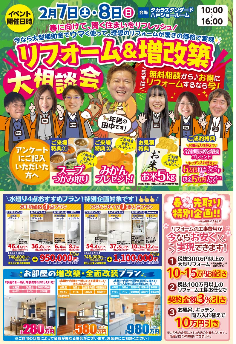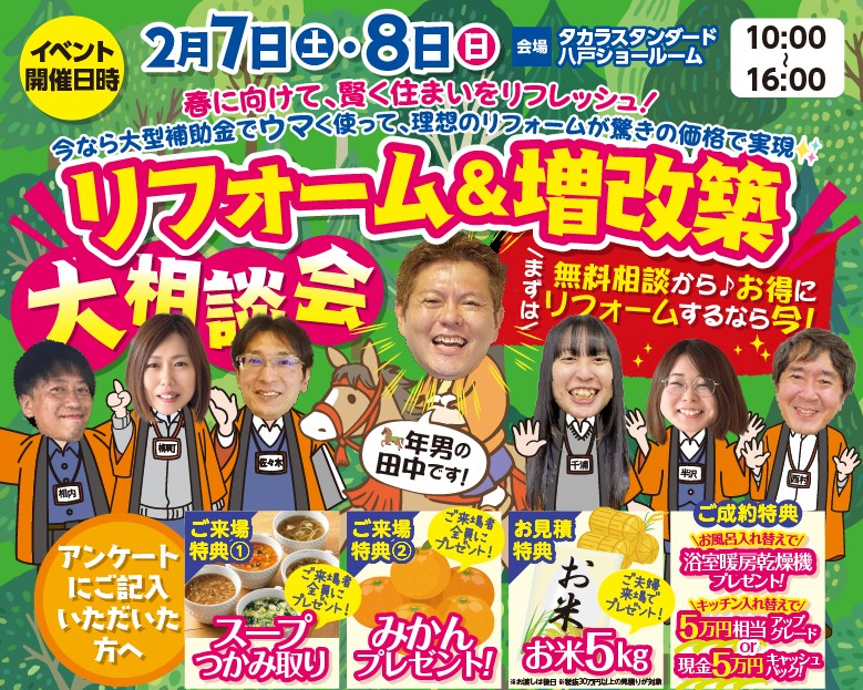こんにちは!八戸市のリフォーム会社 株式会社フジケンザイです 2/7㈯・2/8㈰に行う リフォーム&増加築大相談会のお知らせです(*^-^*) 今回のイベントは、タカラスタンダード八戸ショールーム にて開催いたします。 ※イベント当日は、当社ショールームは営業しておりません。 お手数をおかけしますが、イベント会場にご来場いただくか またはHP・お電話(フリーダイヤル:0800-919-1236)にてお問合せ下さい。 もくじ 1)日時・場所 2)各種特典 1)日時・場所 会場 タカラスタンダード八戸ショールーム 日時 2/7㈯・2/8㈰ 両日共に10時から16時まで 折込チラシ 要チェック⇩ (おもて面) (うら面) 2)各種特典 事前のご予約を頂いた方には、 お米券500円分 プレゼント! ご来店予定の前日までにご予約下さい。 簡単なアンケートにご記入いただいた方には、 うれしい特典を4つご用意しております!! ご来場特典①スープつかみ取り (※1組様1回限りです) ご来場特典②みかんのプレゼント! お見積特典 ご夫婦来場でお米5キロ 来場特典にプラス!ご夫婦でご来場いただいたお客様には5キロのお米を進呈いたします。 ※お見積金額 税抜30万円以上の方が対象 (※お渡しは、現地確認時もしくはお見積り提出時とさせていただきます) 更に更に♪ ご成約 特典その1~お風呂入替工事の方~ 浴室暖房乾燥機 無償プレゼント! ご成約 特典その2~キッチン入替工事の方~ 5万円相当のオプション無償アップグレード! ご成約 特典その3 現金5万円キャッシュバック!! ※ご成約特典は併用はできません。 みなさまの来場お待ちしております(^^)