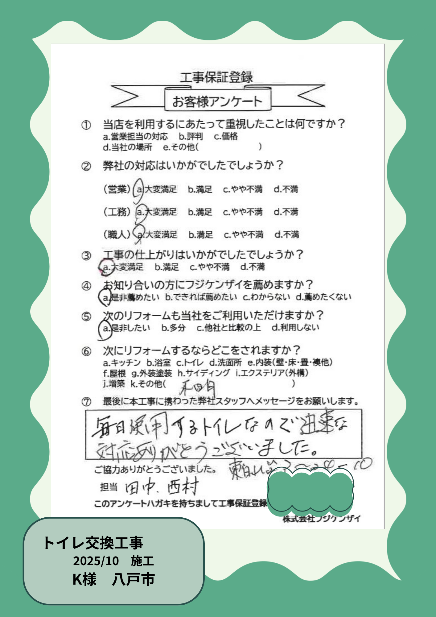弊社では工事後に工事保証書を発行しております。 万が一、工事後に不具合が発生した場合は、お電話(℡:0800-919-1236)にてご連絡ください。