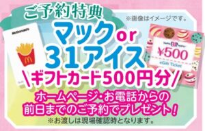 また、事前のご予約を頂いた方には、マックor31アイスのギフトカードプレゼント!