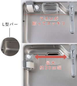シンクにL型のバーがついていて、小物置きやごみポケットを