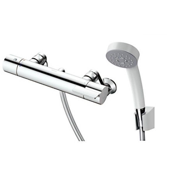 自動温度調節機能付の水栓、バスルームで使用されます。左側のハンドルで温度を設定すると、SMAコイルが伸縮し、お湯と水の量を調節します。右側のハンドルで吐水・止水、シャワーの切替えをします。