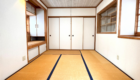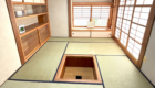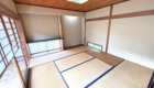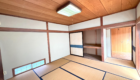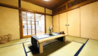 畳の床と障子が特徴的な和室。中央には花が飾られた低いテーブルが置かれ、奥には和風のインテリアが配置されています。