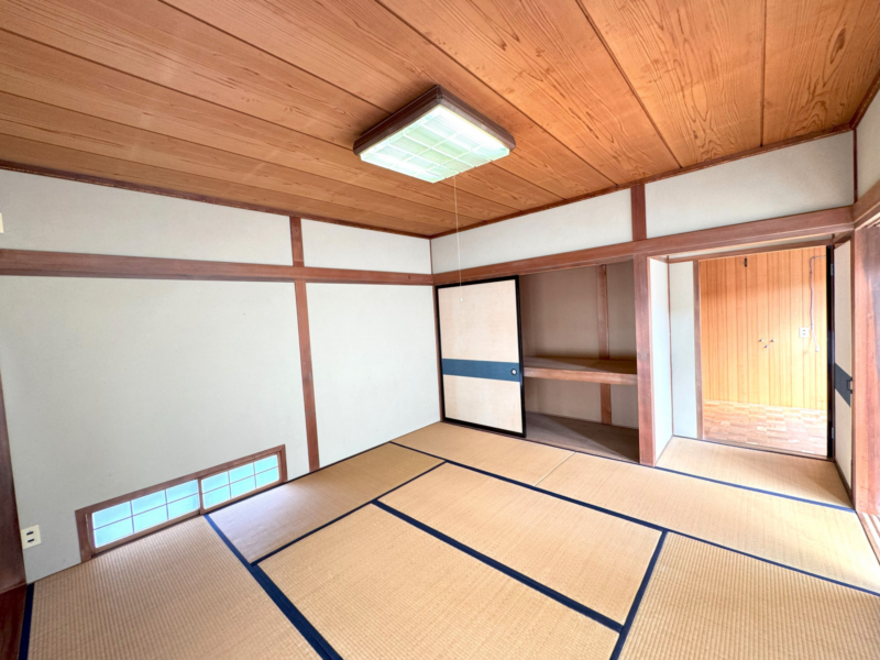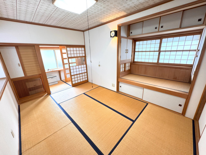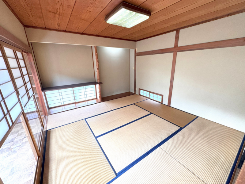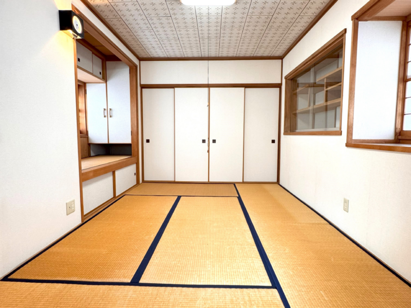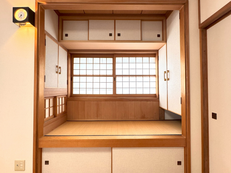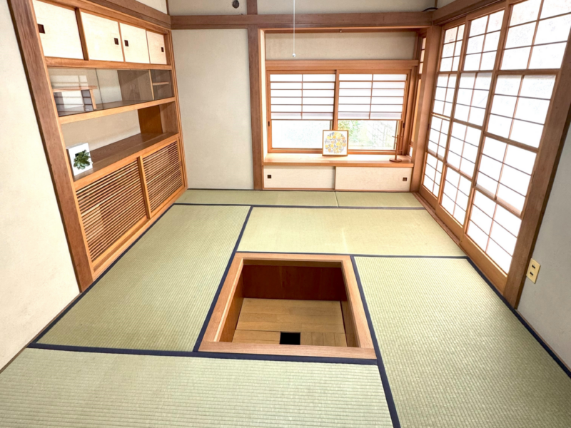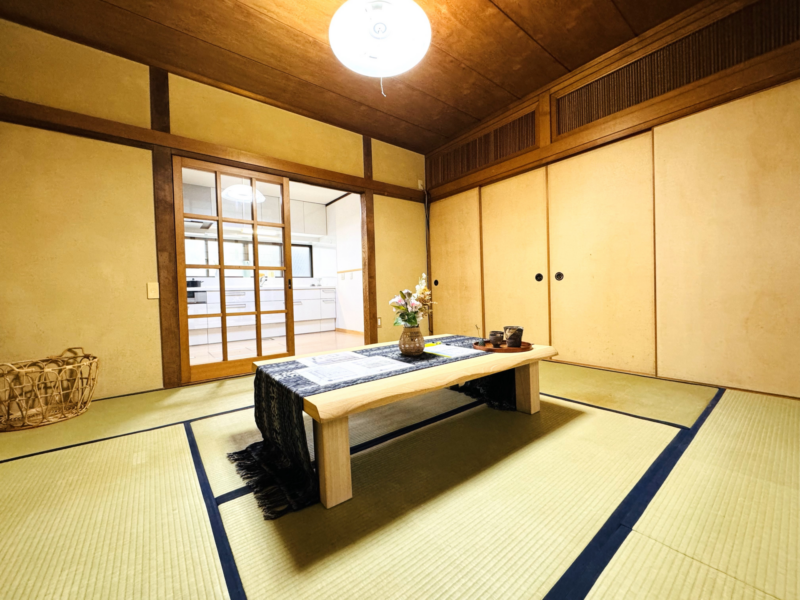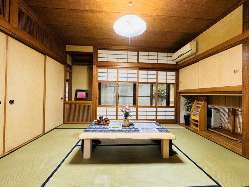 畳の床と障子が特徴的な和室。中央には花が飾られた低いテーブルが置かれ、奥には和風のインテリアが配置されています。