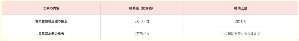 ①の給湯器の設置に合わせて、以下のいずれかの撤去工事を行う場合、その工事に応じた定額を補助。