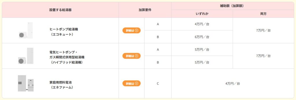 補助対象となる給湯器は、機器ごとにそれぞれの性能要件を満たしたものに限る。