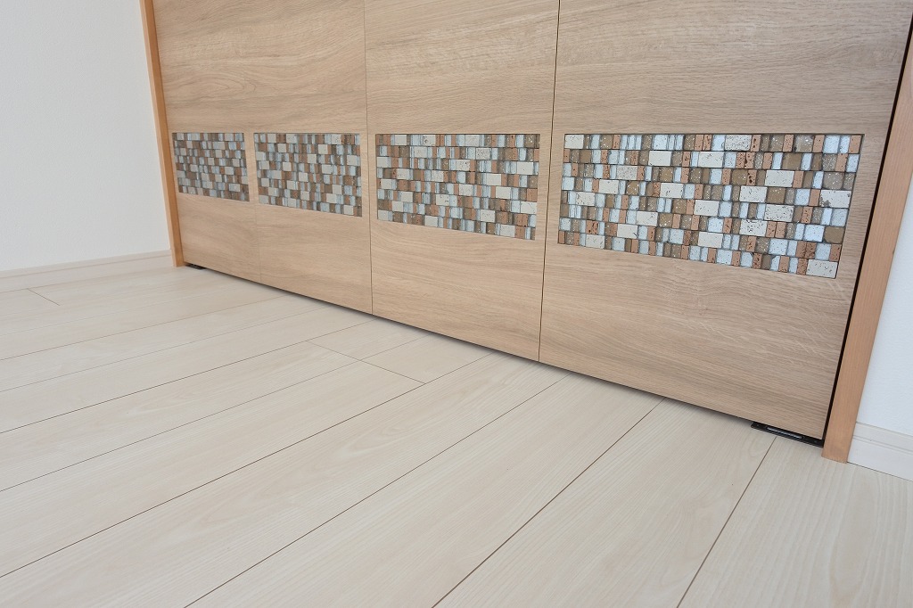 ガラスタイルがランダムに敷き詰められていて、ありきたりな建具のいいアクセントになりますね!