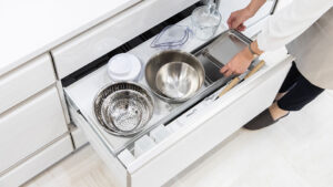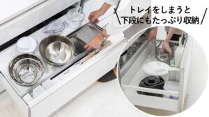 引き出し上部の空きスペースに、トレイを設置しより多くのものが収納できます。