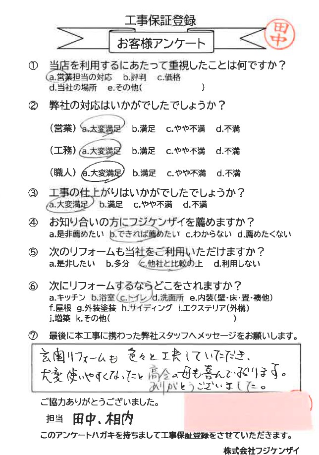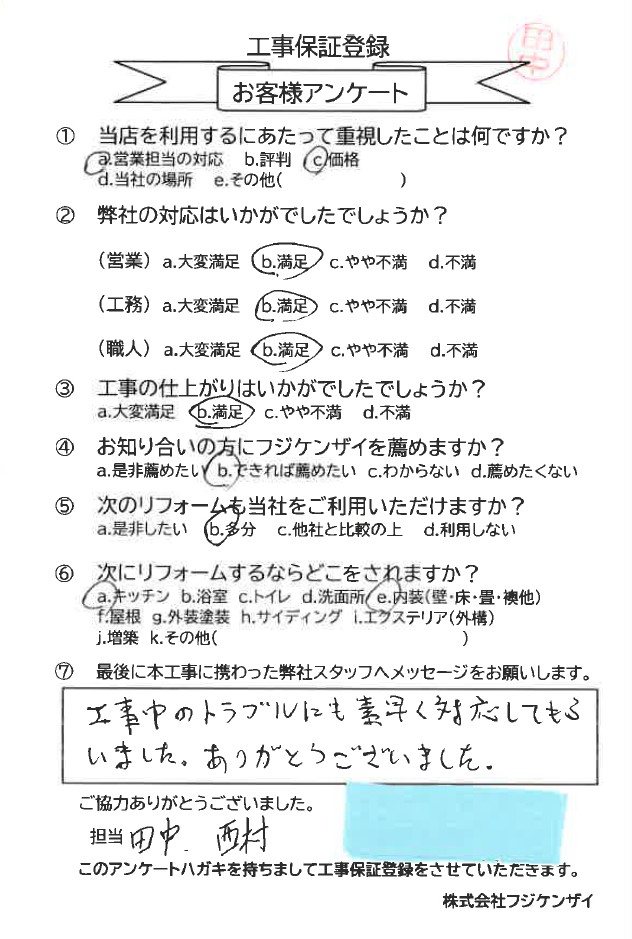 フジケンザイでは、リフォーム工事が完了したお客様にアンケート付きのハガキをお渡ししています。 今回は掲載許可をいただきました【お客様アンケート】をご紹介します。リフォーム会社選びのご参考にしていただければ嬉しいです!