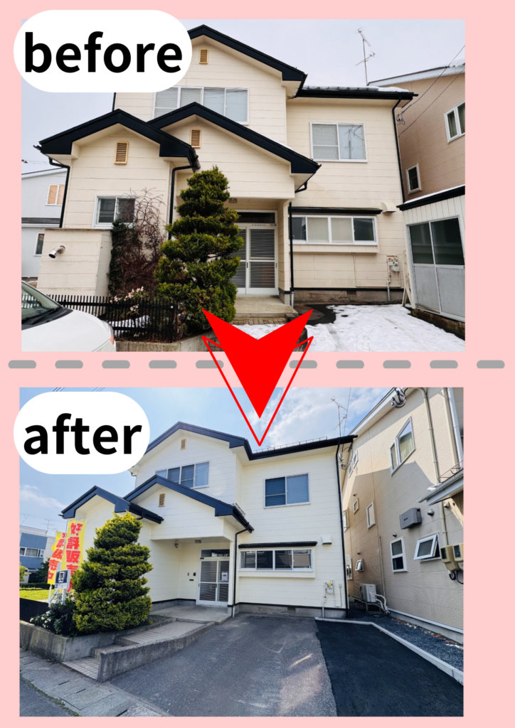 リフォーム概要浴室・キッチン・洗面の交換、和室→洋室(3部屋)、給湯器交換、クロス貼替、フロア張替、竪樋交換、外構、物置撤去、屋根・外壁塗装