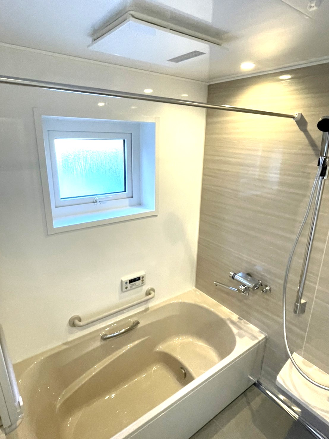 今回施工したタカラスタンダードの浴室は、浴室全体を包むように断熱材が入っているため、快適にご使用いただけます。天井には浴室暖房乾燥機が付き、洗濯物を干すパイプもついているので家事らくになりました!壁は磁石が付くホーローパネルです!マグネット収納により収納力アップ!ワイドカウンターなので洗面器も置けます。