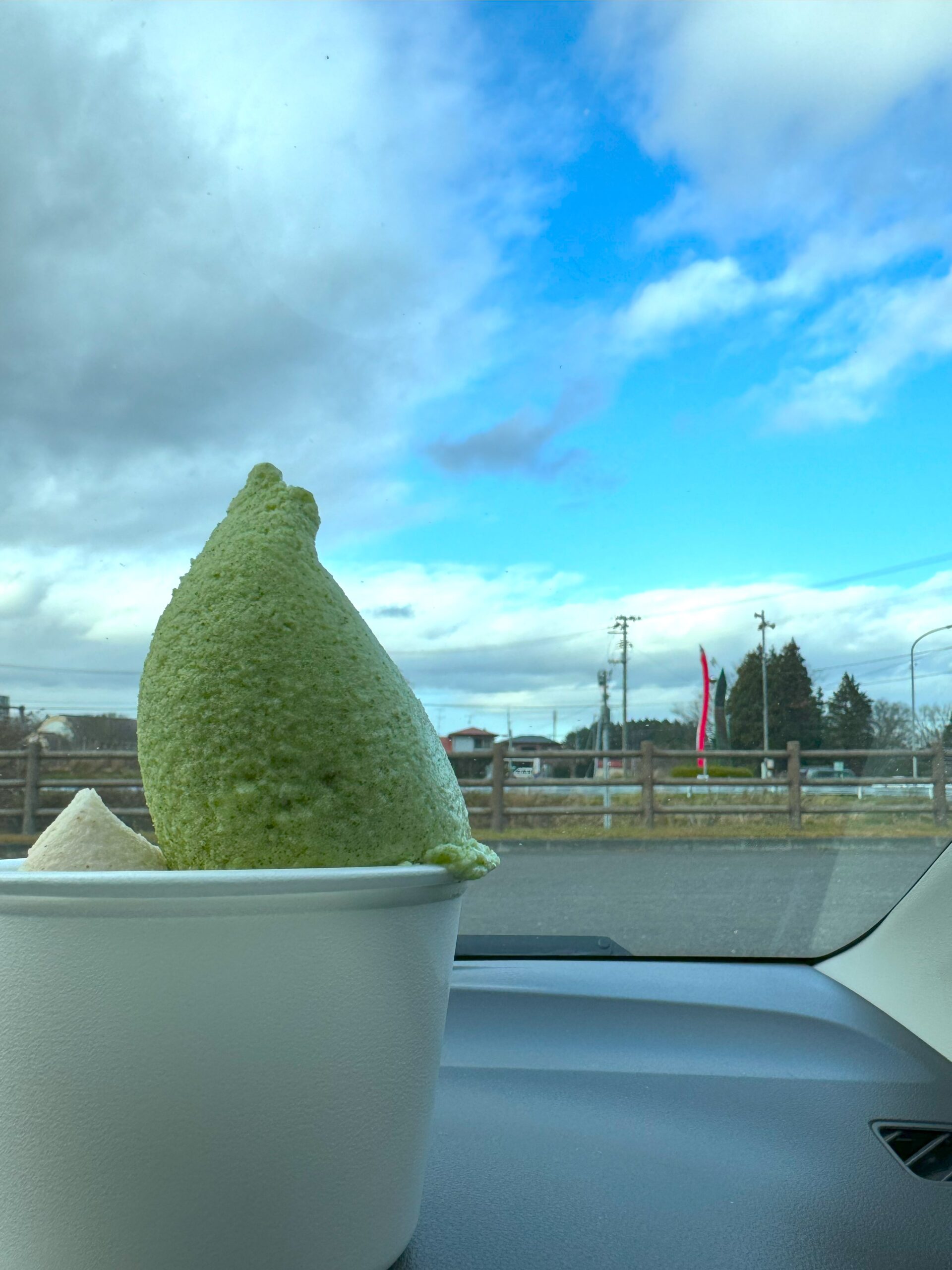 車のヒーターをつけながら向かったのは、美味しいジェラートを食べられるお店。上司のおすすめは「早生そば」と「桑の葉」とのことで、2つ食べてみました。その日は蕎麦が飽和していましたがジェラートは別腹でした。甘すぎることがなく、ちゃんと蕎麦の風味が感じられる不思議な味でした。桑の葉は抹茶のような味です。和+和が外れるわけがなく、とても美味しかったです。