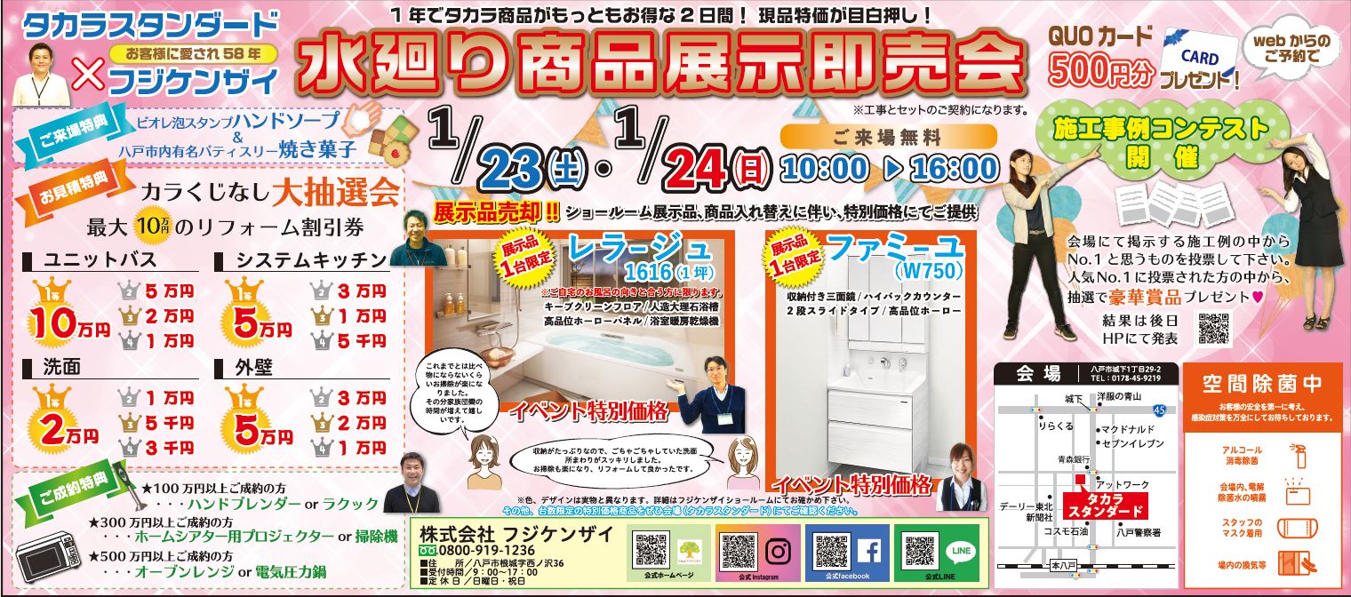 フジケンザイでは1/23㈯・24㈰の2日間に渡り「水廻り商品展示即売会」を実施致します。