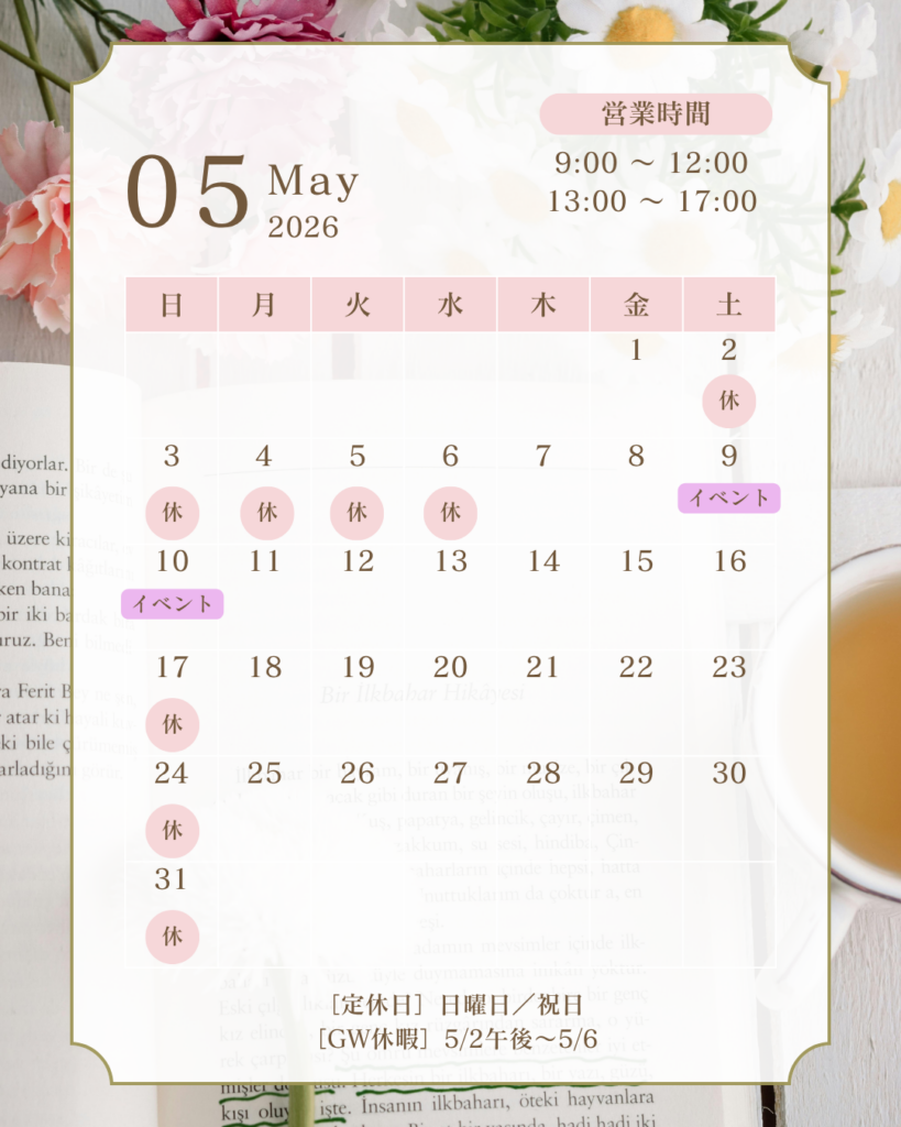 GW期間中や臨時休業の日がございますので、ご確認いただけますと幸いです。